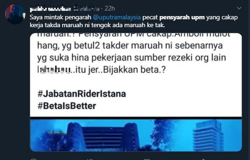 Grab Food Panda KERJA TIDAK BERMARUAH. Tapi camne leh keluarkan tak bermaruah. Katanya universiti itu juga sering memberi peringatan dan memantau warganya supaya mematuhi perkara-perkara yang telah ditetapkan dan tidak memberi sebarang kenyataan yang berbentuk provokatif menyinggung dan memberi persepsi negatif.