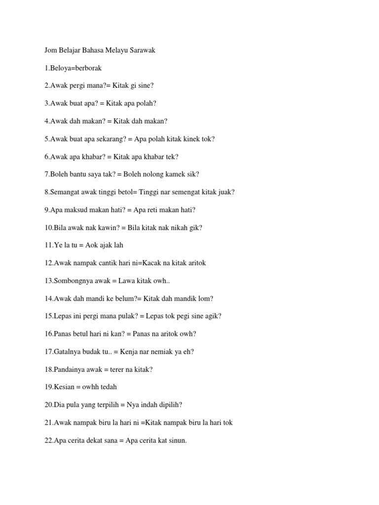 Sidak nya - Mereka Ayat. Menteri Pelancongan Kebudayaan dan Kesenian Sarawak Abdul Karim Rahman Hamzah berkata tiada penutupan penuh terhadap sektor ekonomi dan sosial di negeri itu. Rasa tak bermaya Mah wa ku Bahasa Ringkas Rasa malas Alas ku Bahasa Ringkas Bukan main lagi bermekap Terit jak beresep Tolong undurkan kereta awak gostan kereta kitak lok Saya nak bawa awak lepak Kamek nak ngajak kitak lepak Saya tak tahu awak camni Kamek sik tauk kitak camtok Awak berimejinasi pasal apa tu Apa dimejin kitak ya.